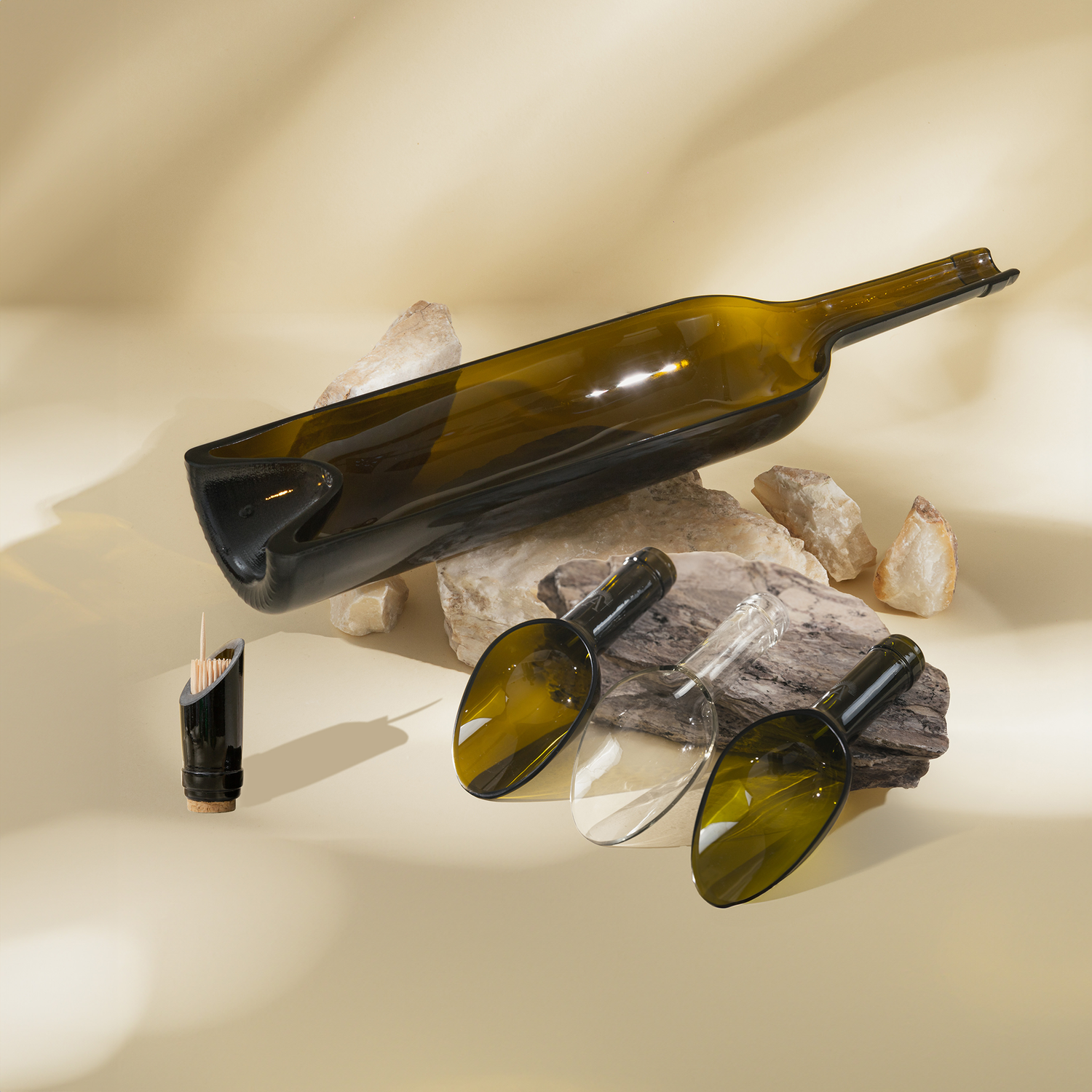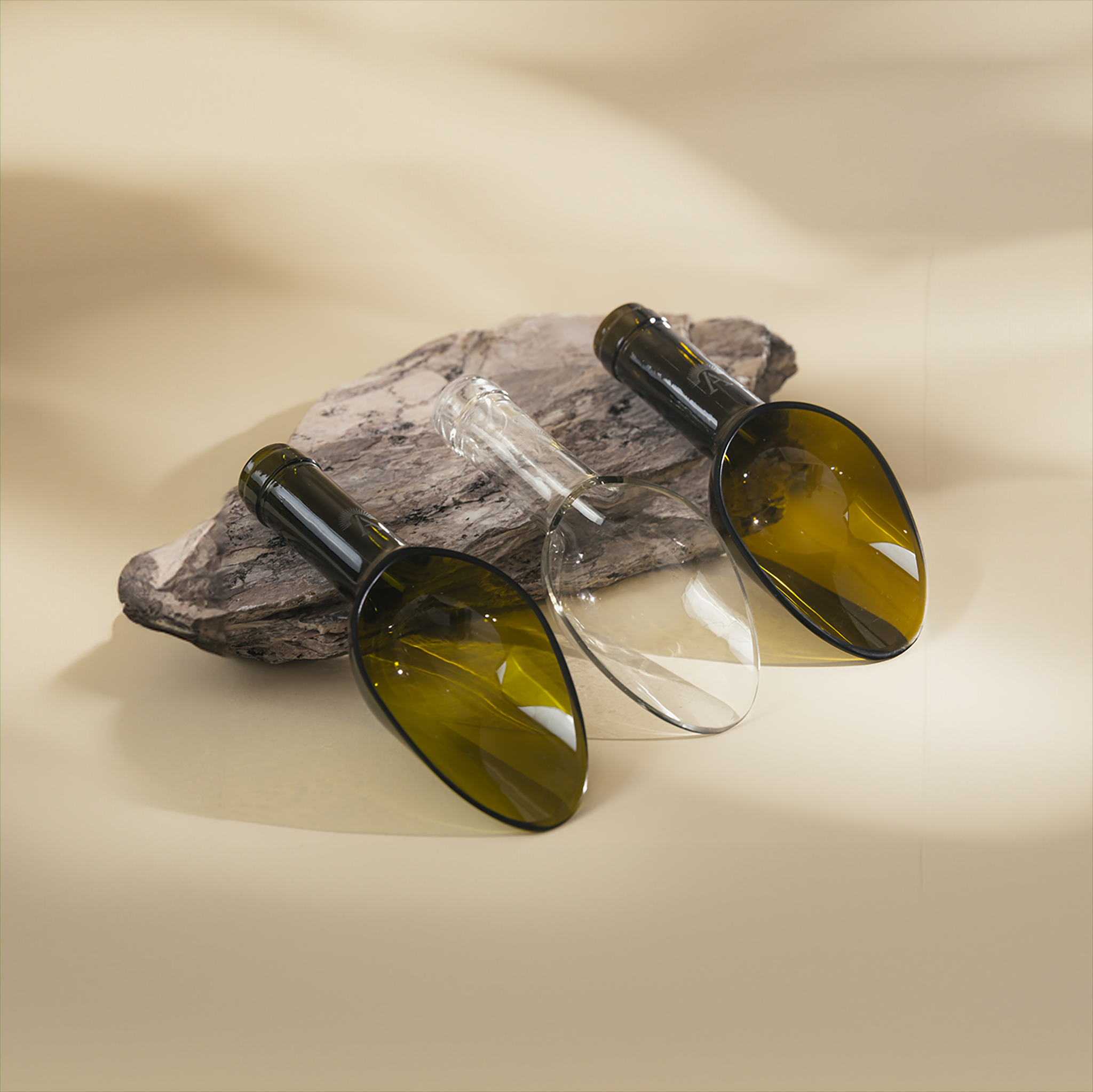 Ogni bottiglia raccolta conserva memoria, materia e potenziale. Interveniamo con precisione artigianale, attraverso il taglio della mola diamantata, trasformando ciò che è stato in oggetto di design essenziale e contemporaneo.